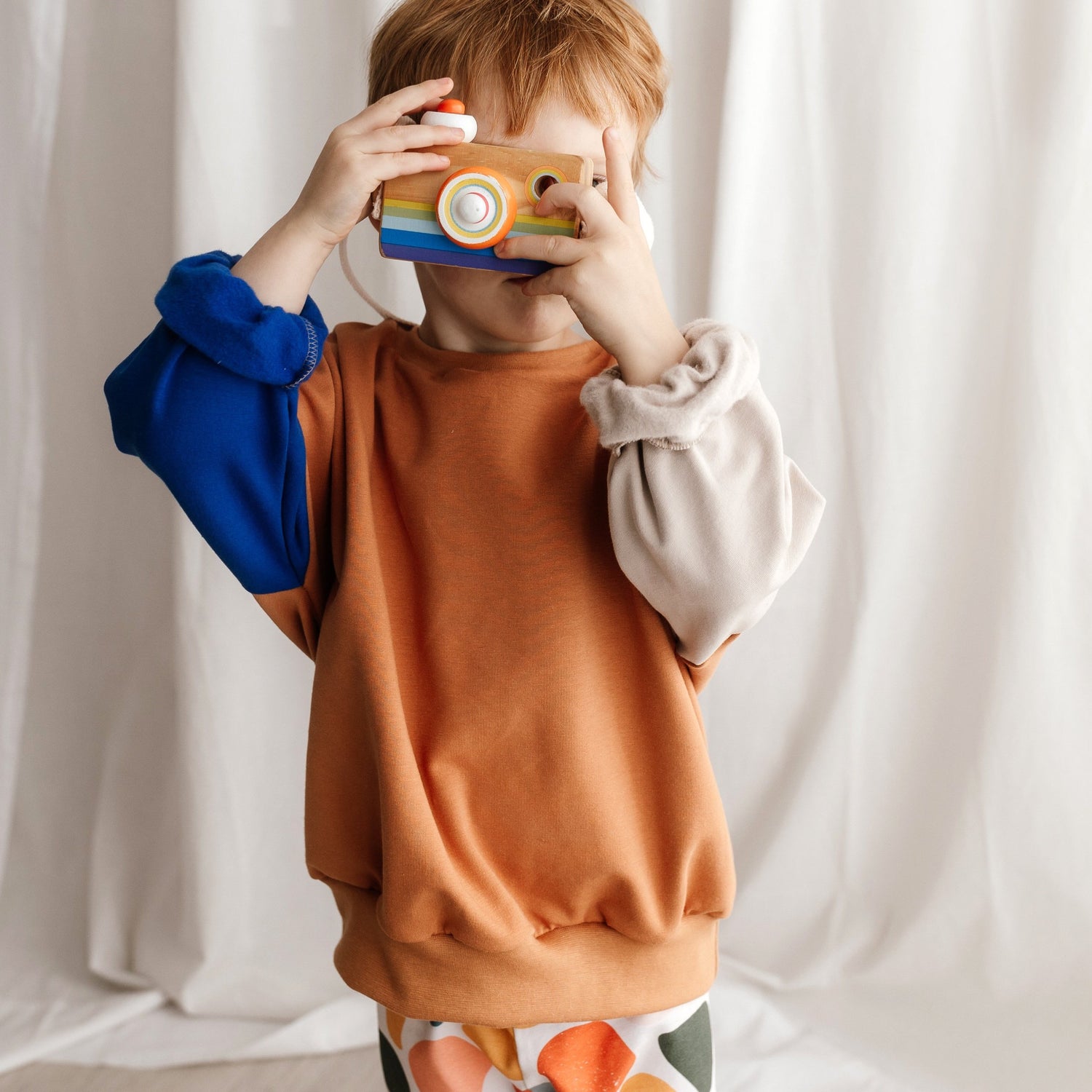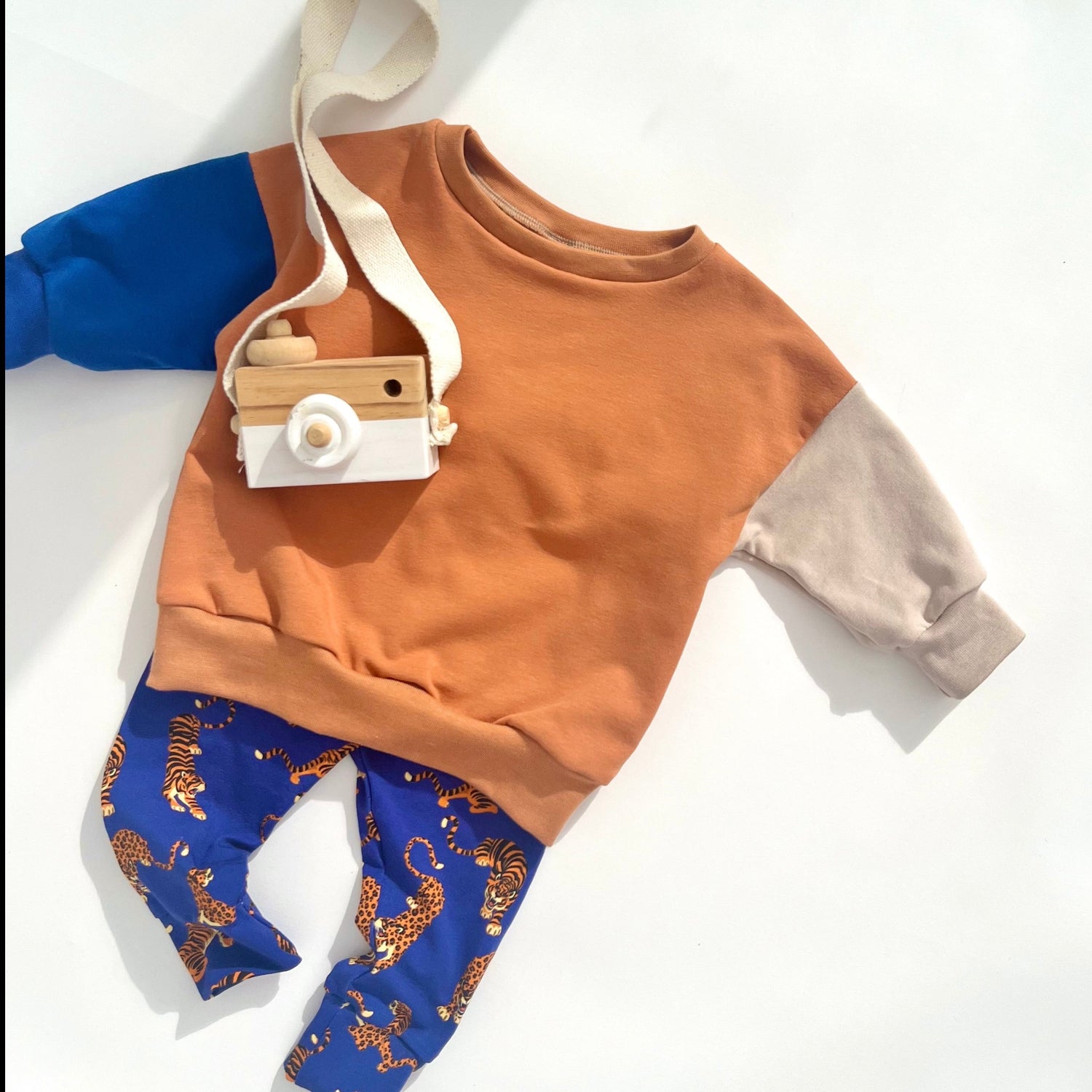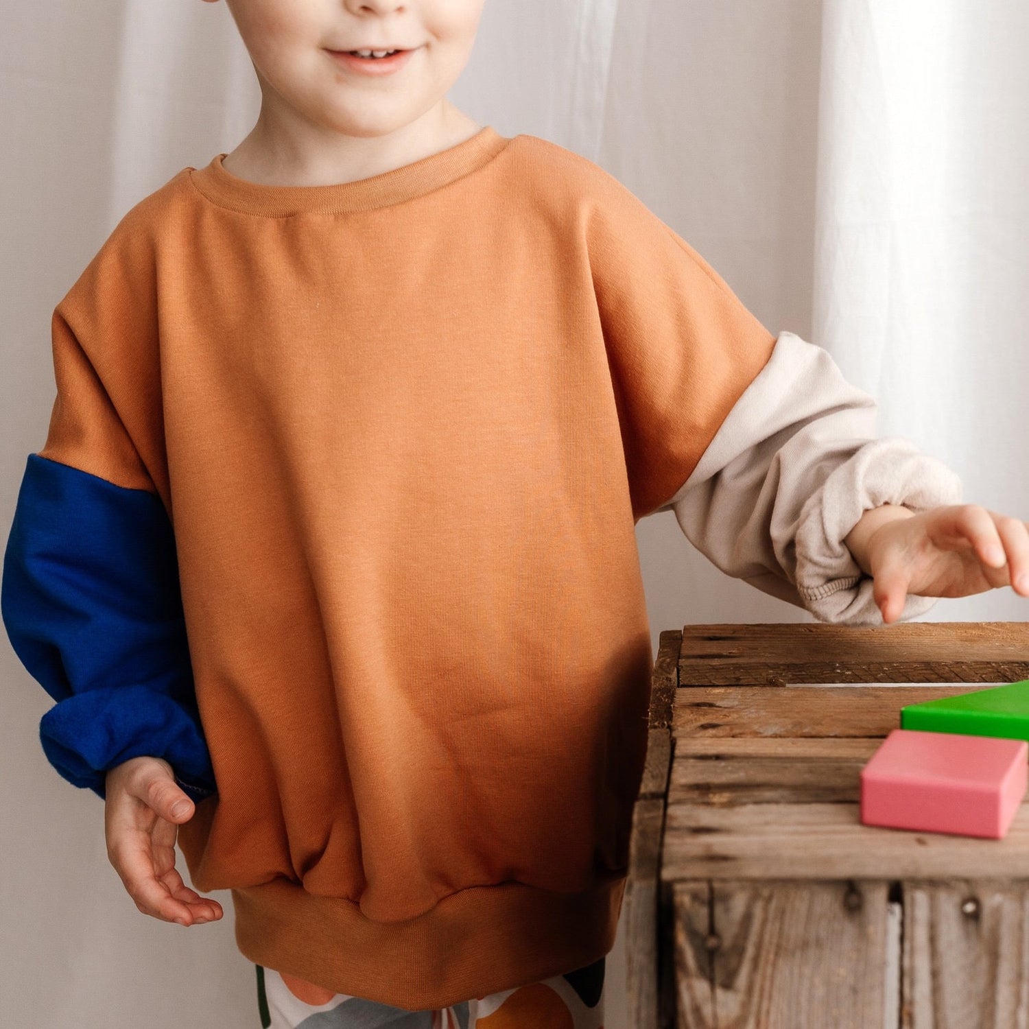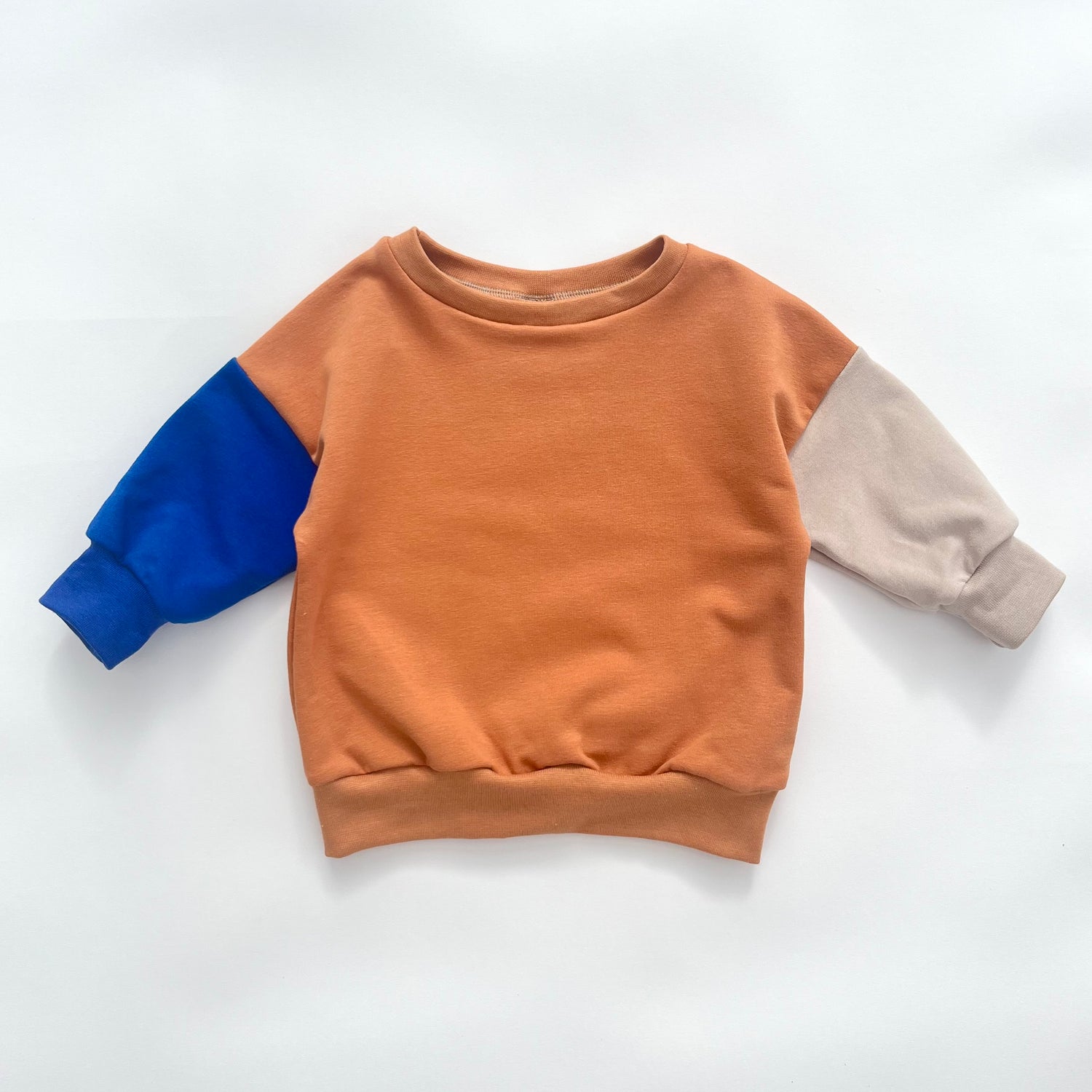Our canyon long sleeve sweatshirt comprises of toffee coloured body with stone and cobalt sleeves.