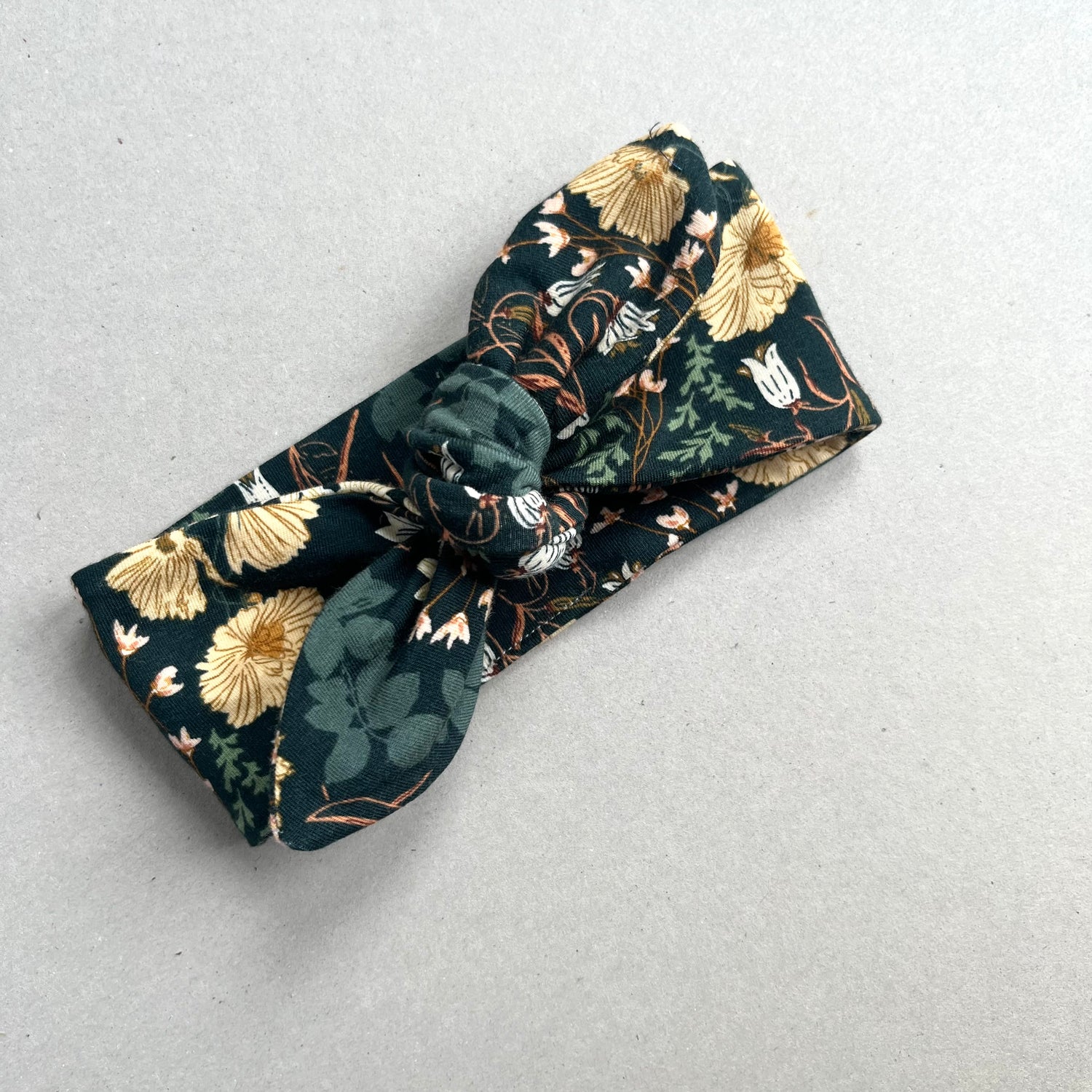 Cool little knotted head wrap in absolutely stunning Dark Meadow print.