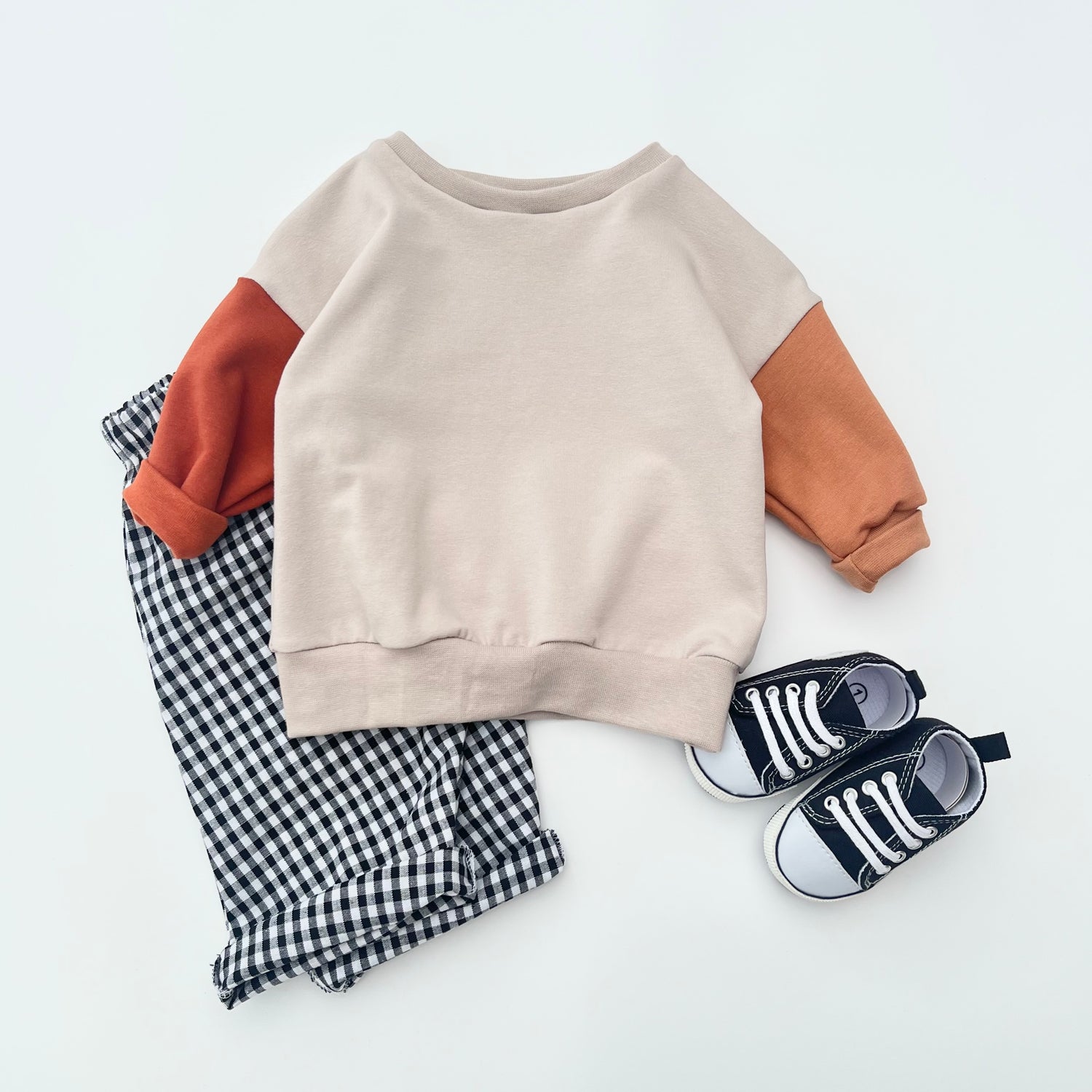 Long sleeve sweatshirt in stone with rust and toffee sleeves.