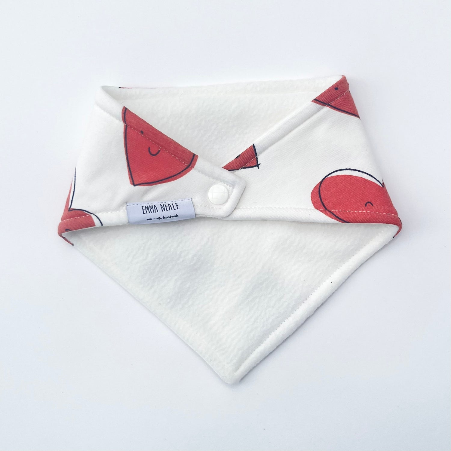 All our bibs are backed in super absorbent polyester micro fleece which is very soft and lovely against babies' skin. The bibs are fastened with KAM snap fasteners.