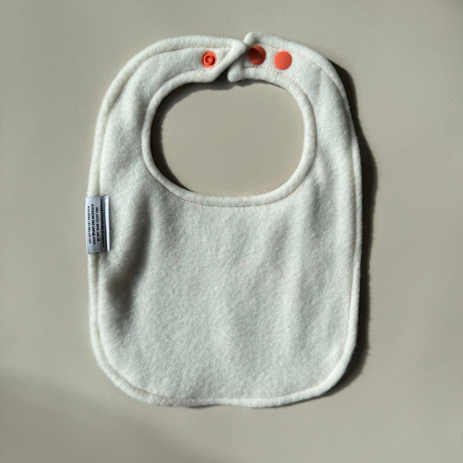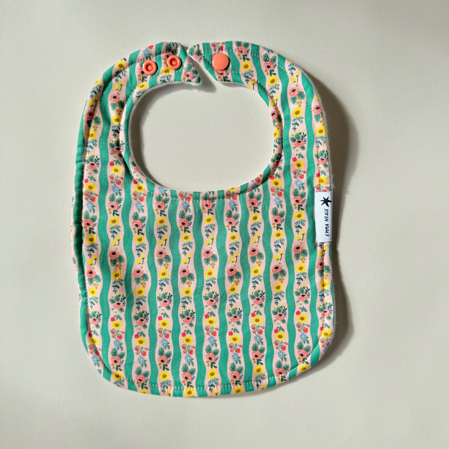 Each bib is backed in super absorbent polyester micro fleece which is very soft and lovely against babies' skin. The bibs are fastened with KAM snap fasteners.