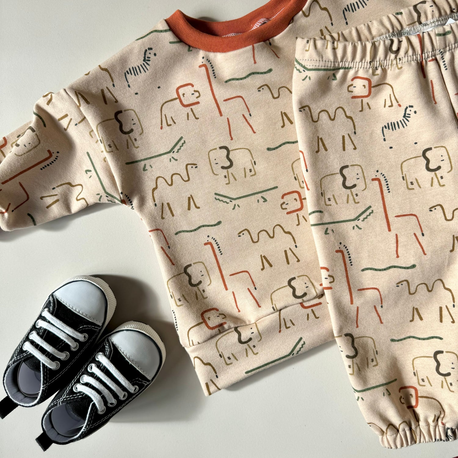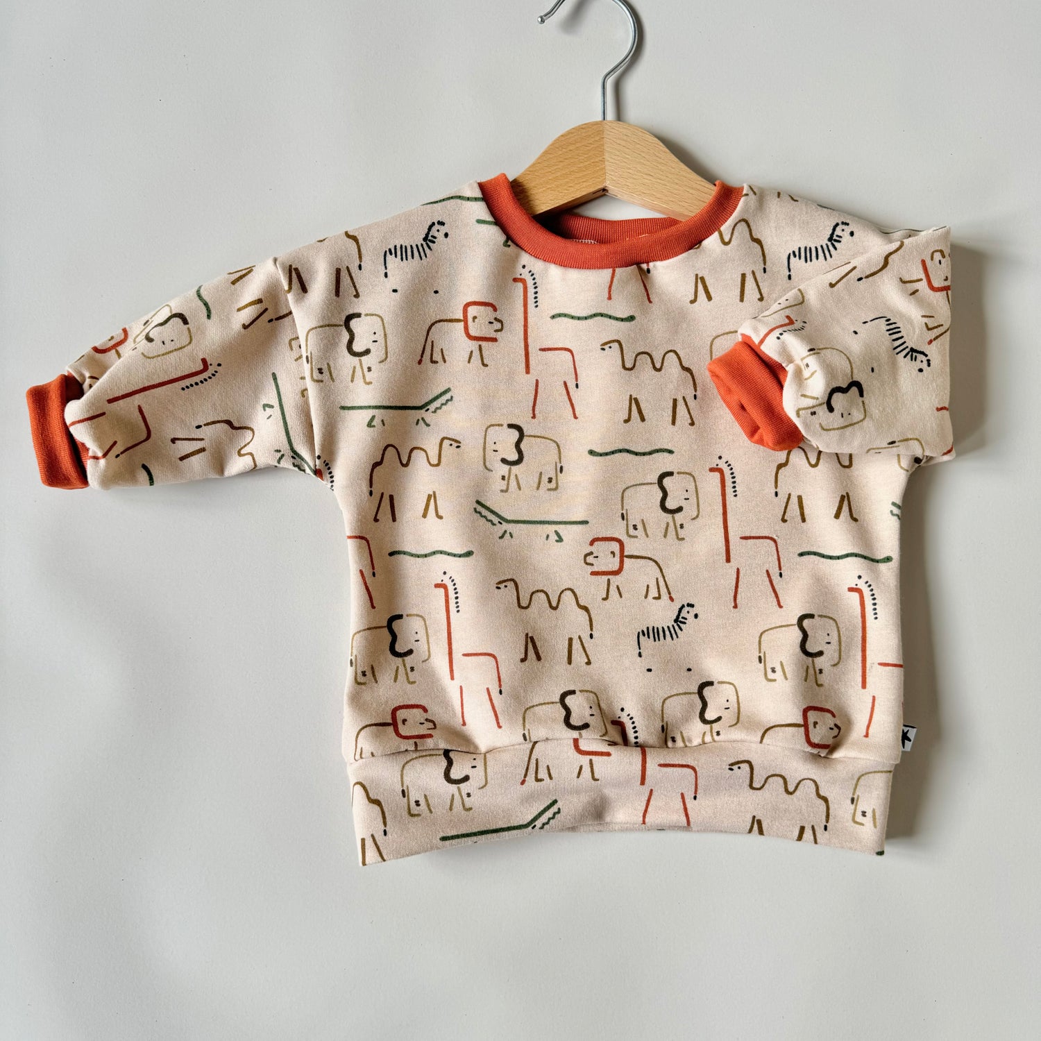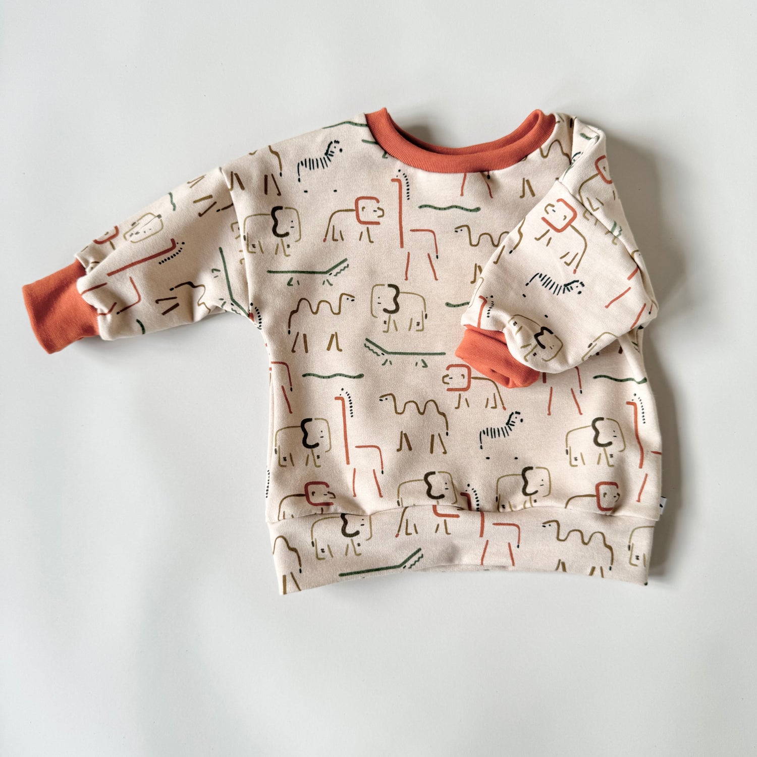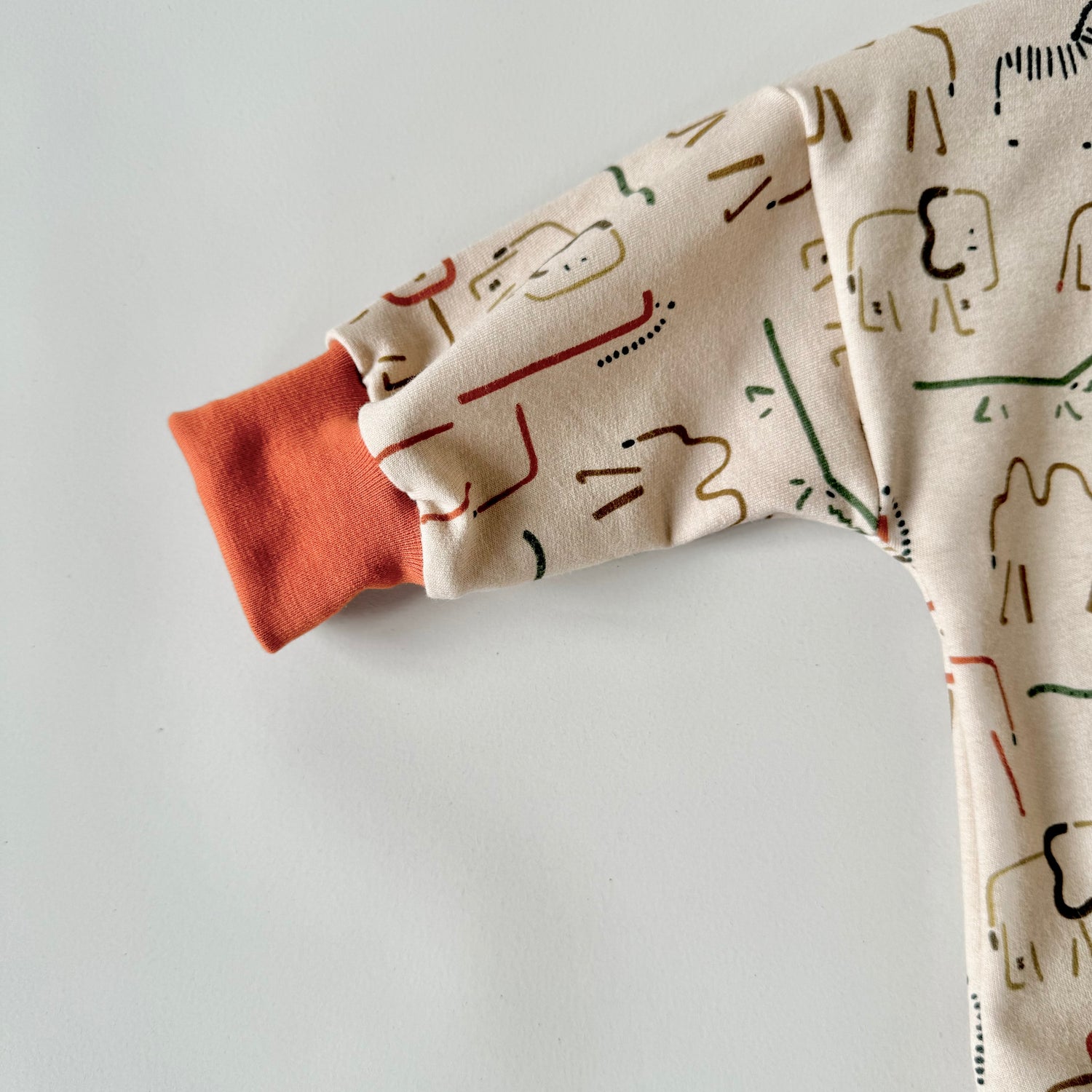 Long sleeve sweatshirt in fun animal print with rust neckband.