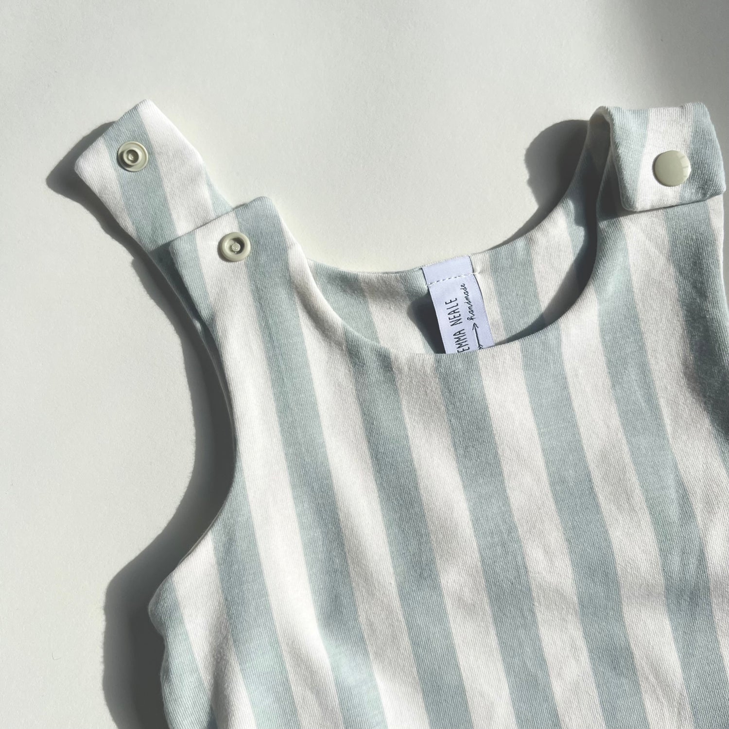 Vintage seaside vibes from this wee seafoam stripe shortie romper!
